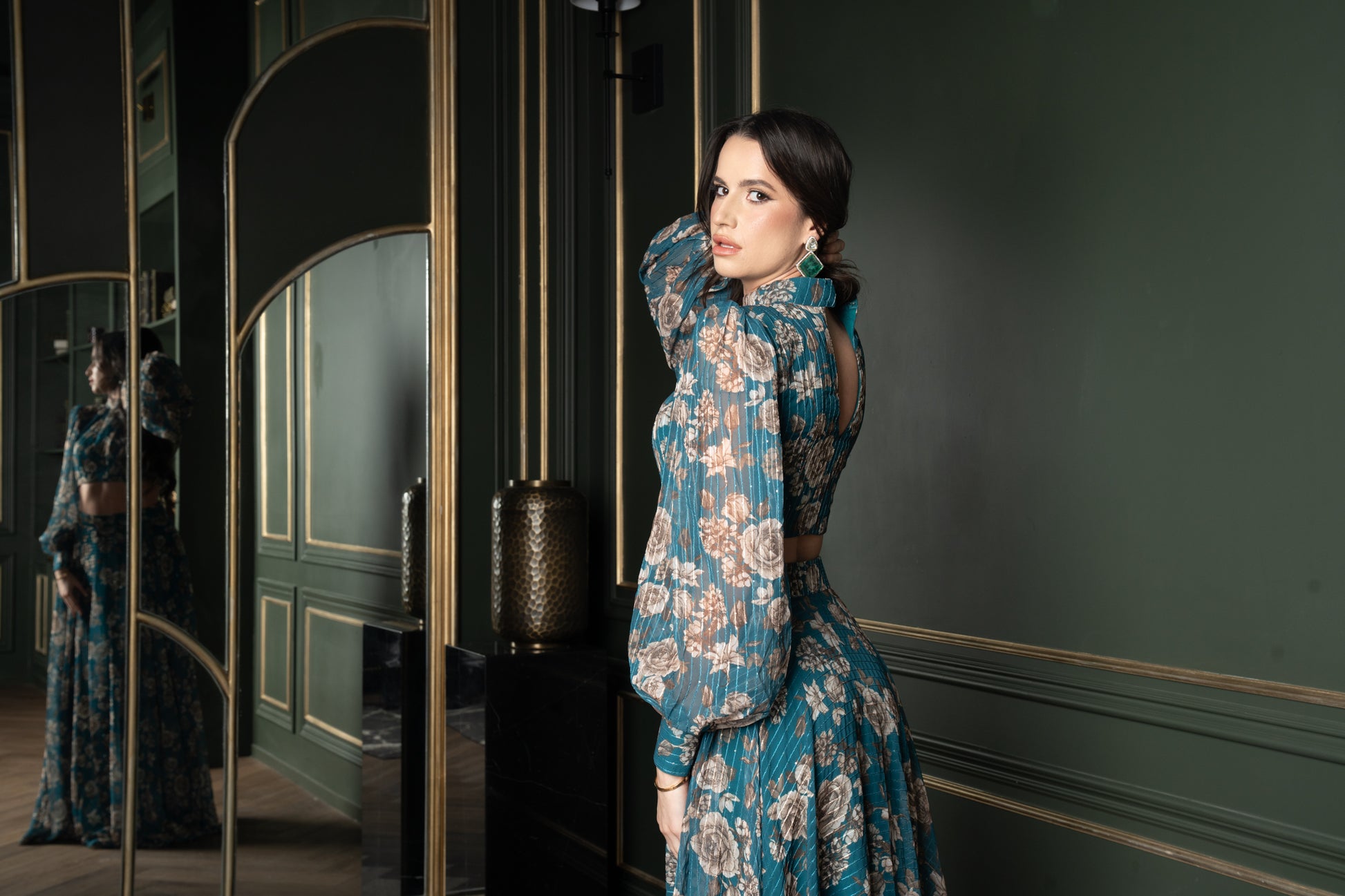 Crafted in pure georgette and finished with custom foil-printed detailing, the look features a voluminous A-line skirt with fluid movement, paired with a structured puff-sleeve crop top and a subtle keyhole back. The clean lines and sculptural silhouette are elevated by the option to create your own print — making every piece one of a kind.