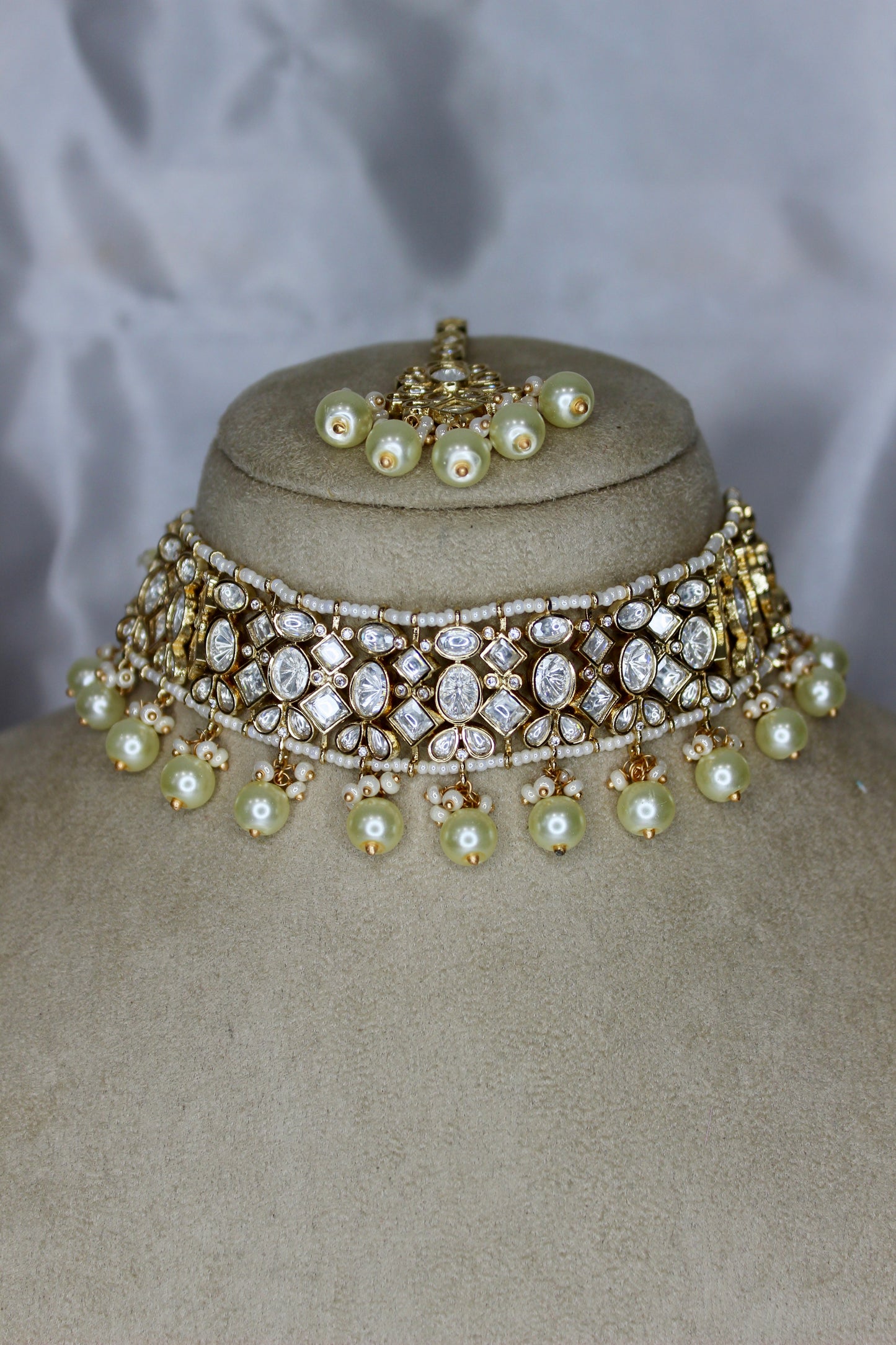 Stylist tip: Best paired with traditional and modern attire, ie, sarees, salwar suits, or a fusion of those with a western cut blouse. Add minimal accessories of similar antique gold and pearl detailed jewels- finger rings, and bangle sets.