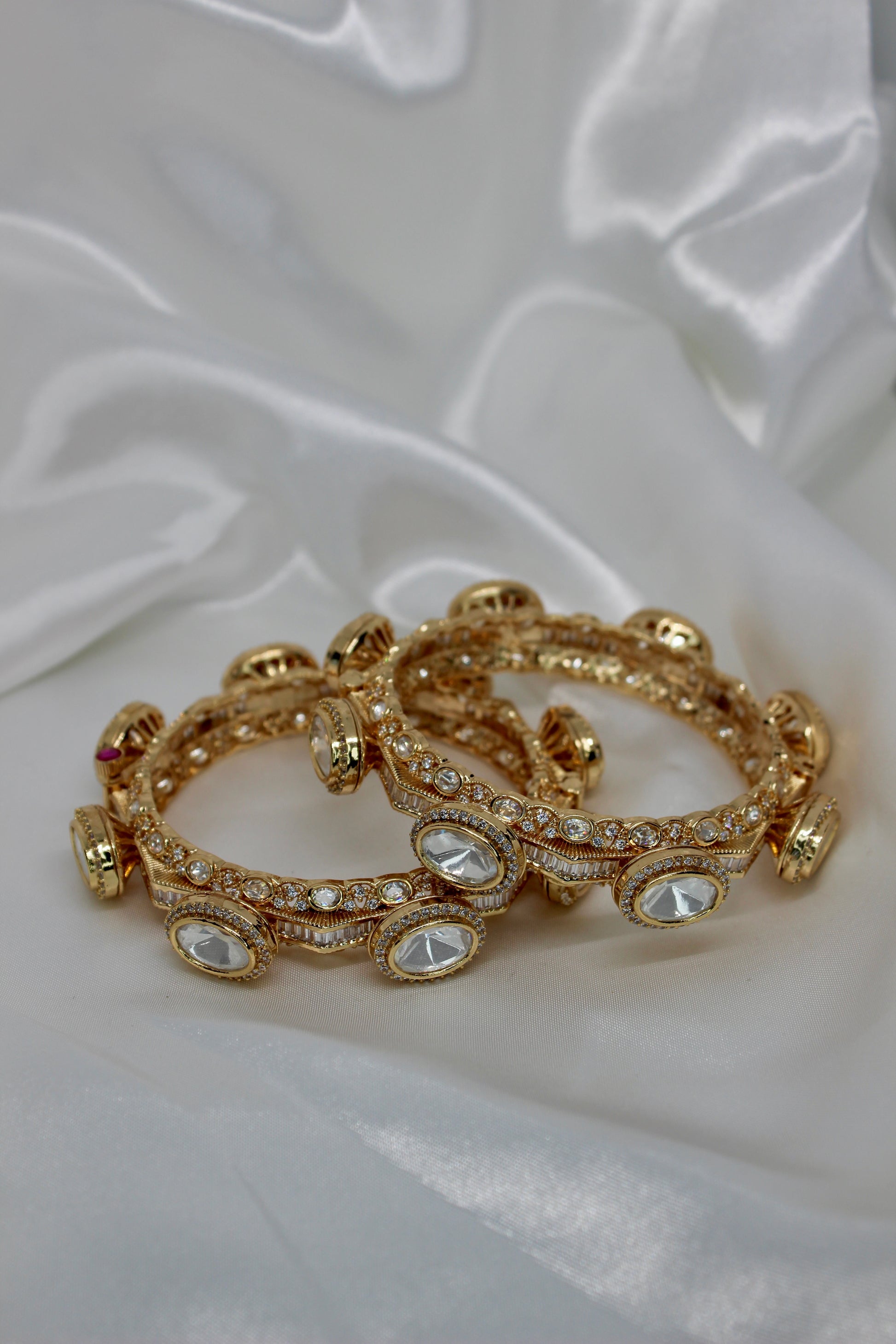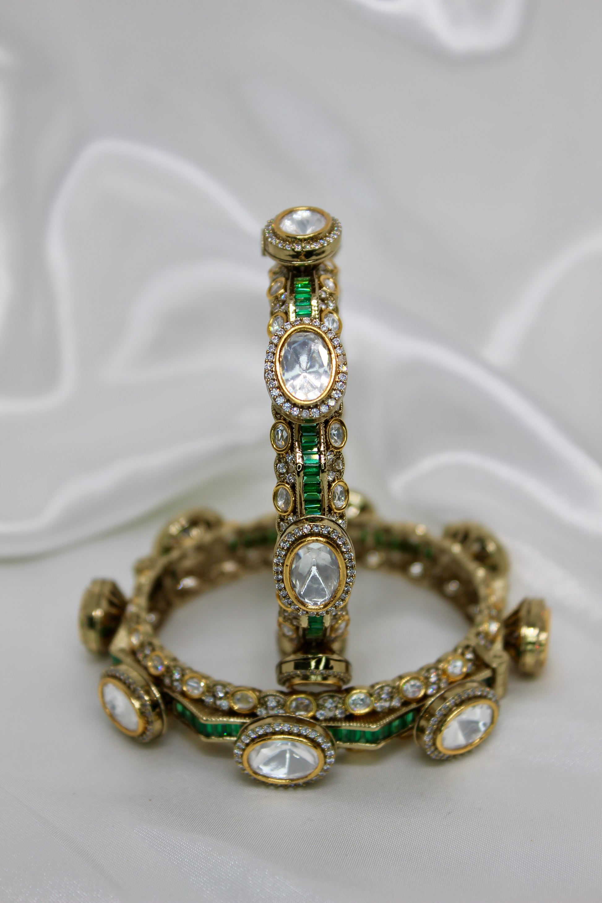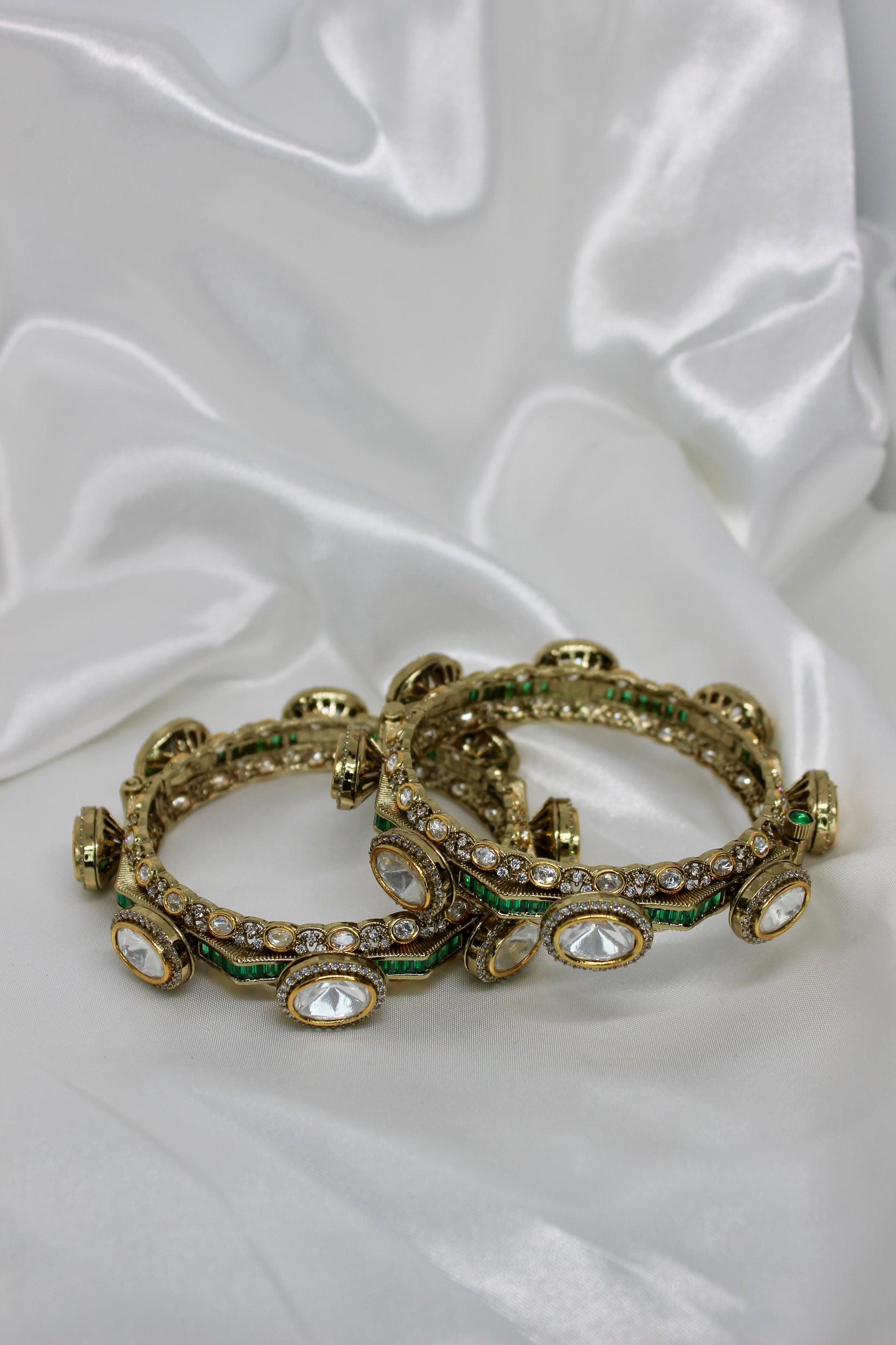 The Raina Bangles are openable kada-style bracelets encrusted with moissanite kundan and uncut stones, available in emerald, ruby, or white gold finishes. Strong enough to stand alone yet versatile for stacking, these bangles embody heritage and pride—an heirloom expression of roots and timeless tradition.