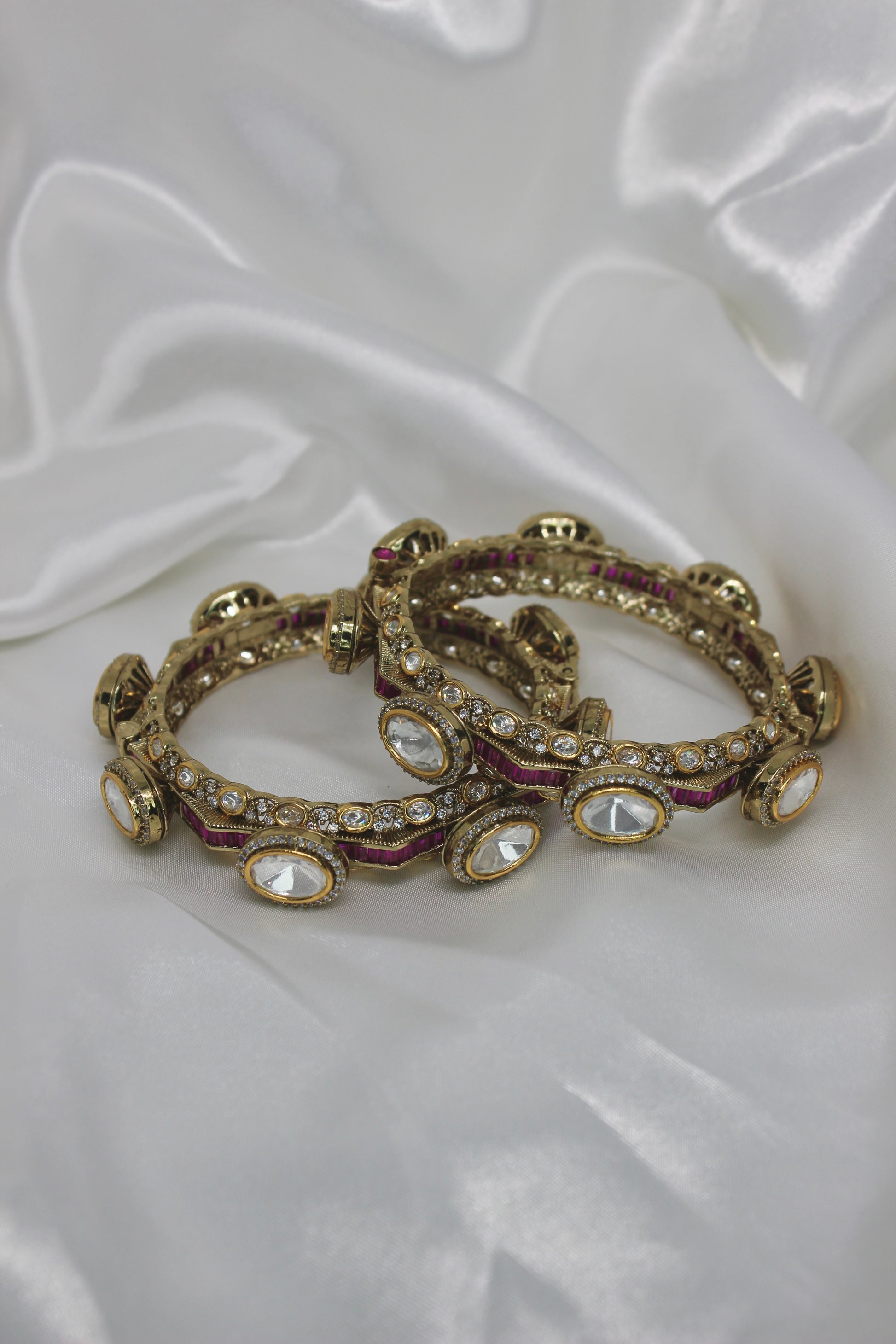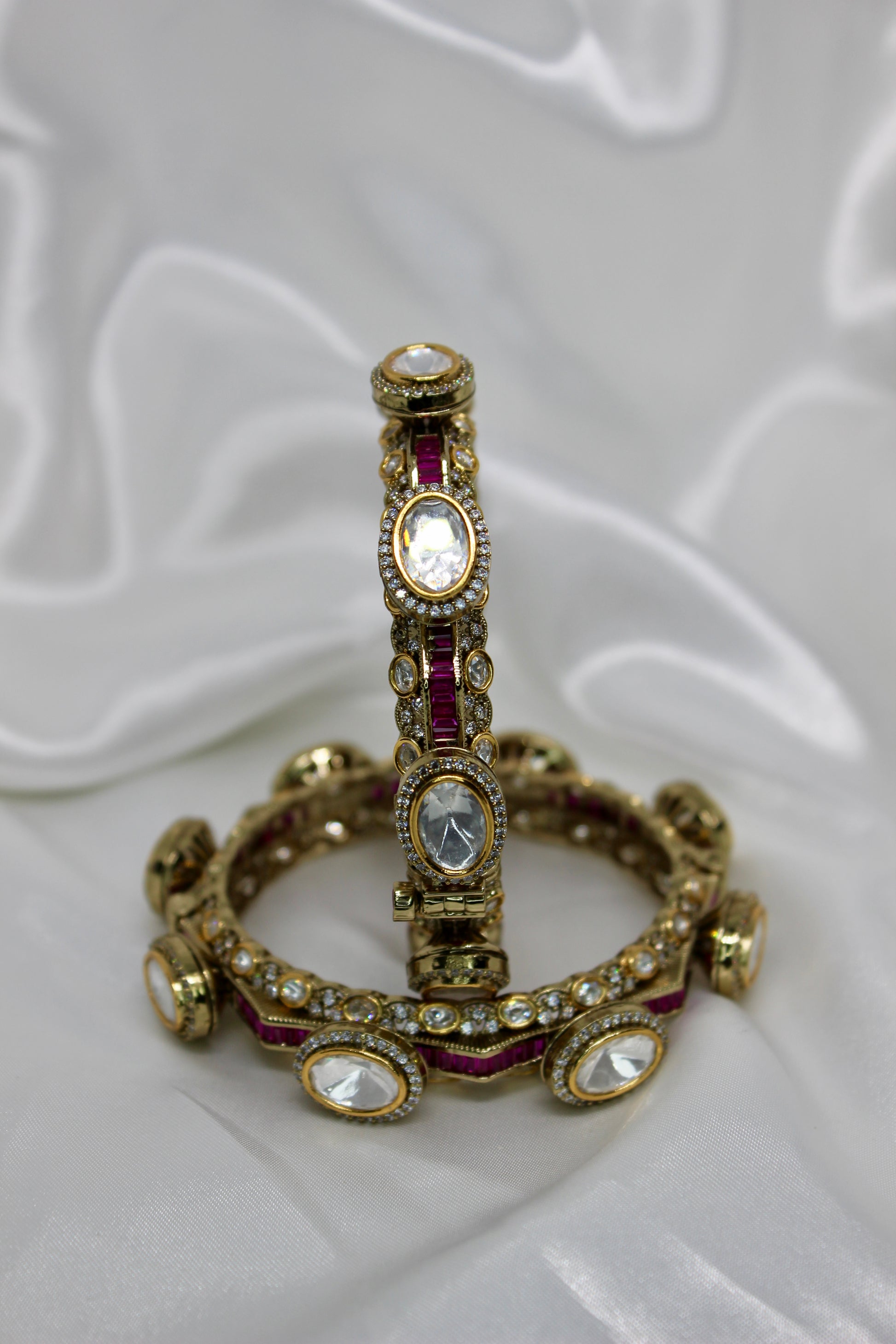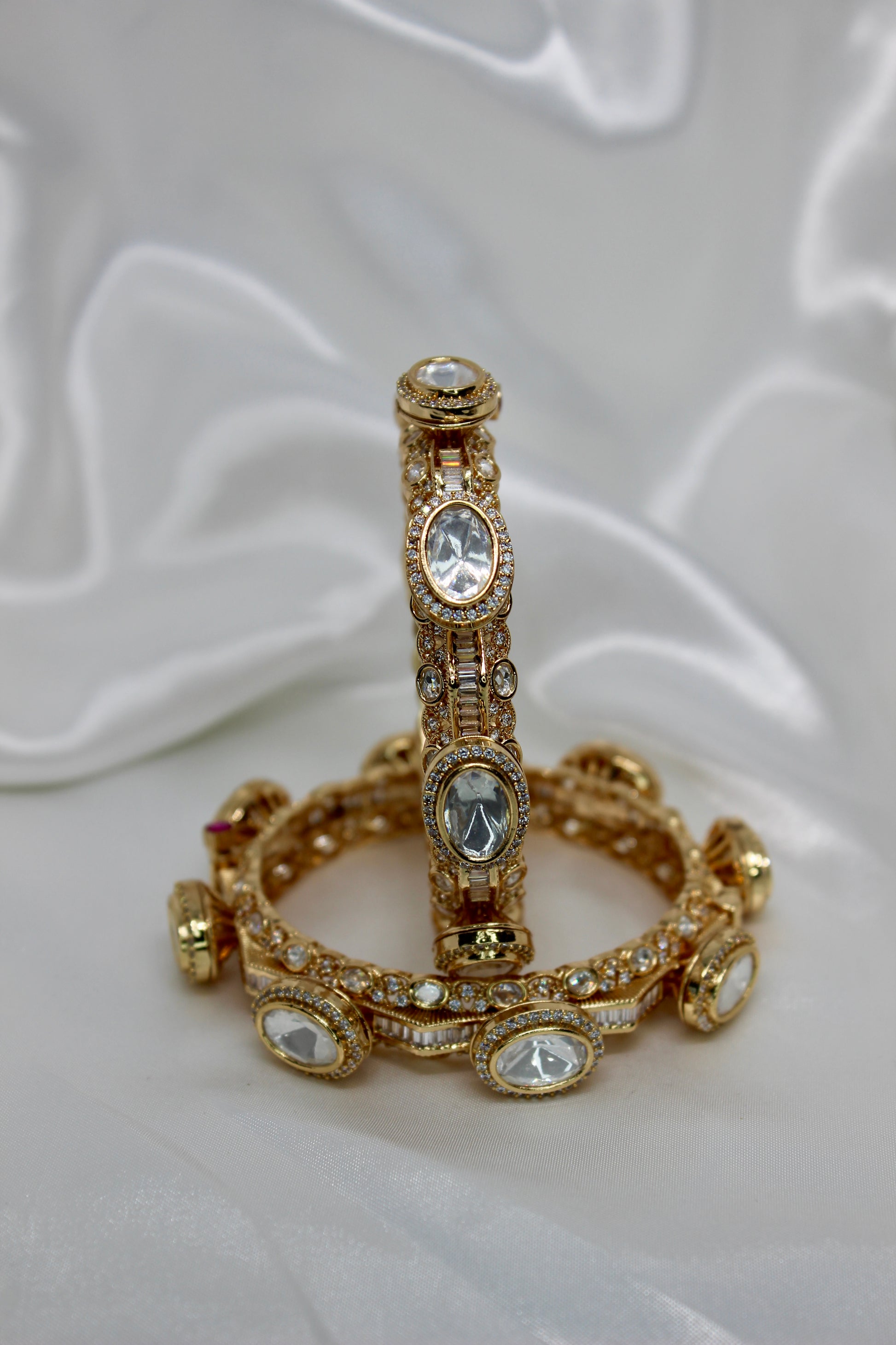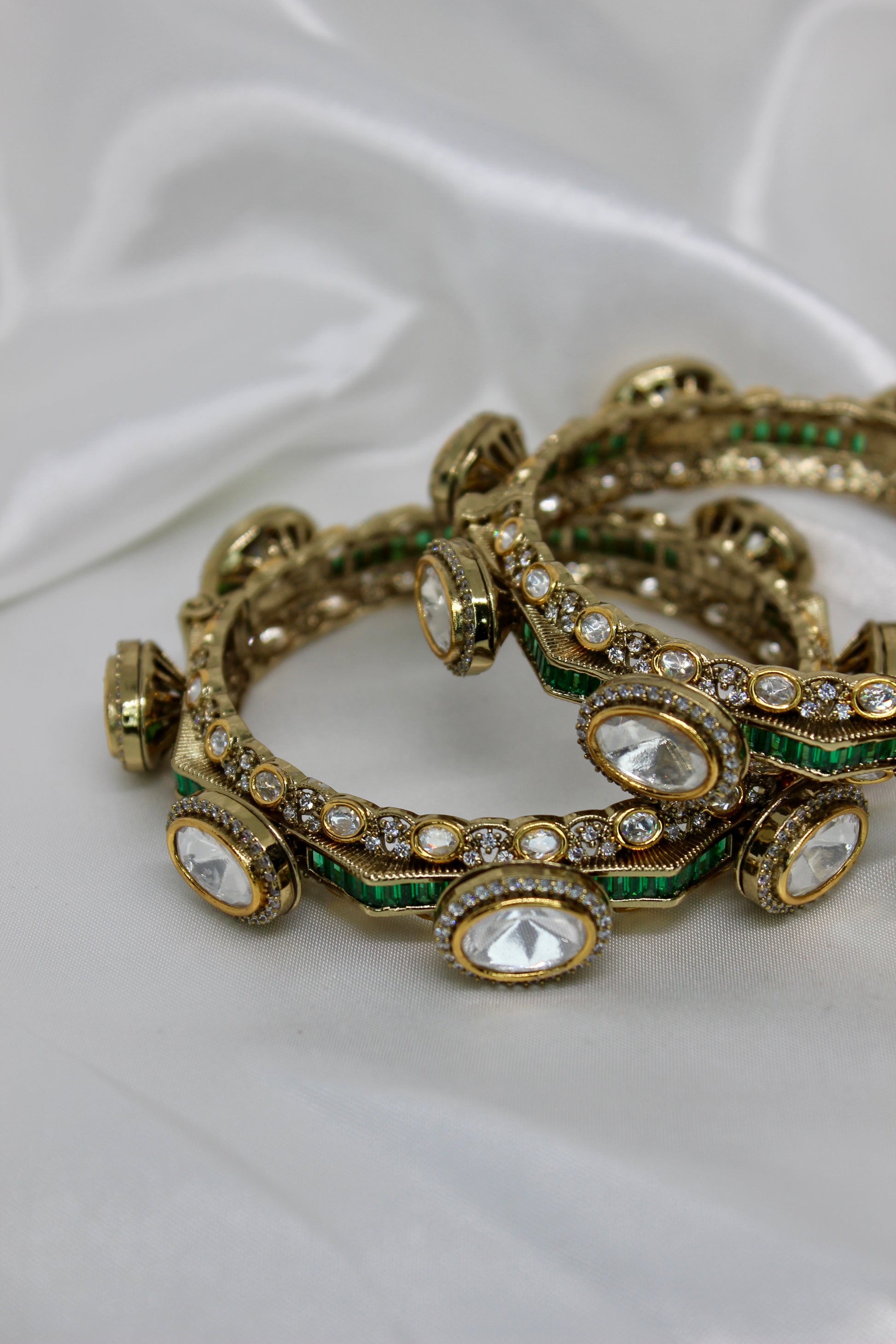 The Raina Bangles are openable kada-style bracelets encrusted with moissanite kundan and uncut stones, available in emerald, ruby, or white gold finishes. Strong enough to stand alone yet versatile for stacking, these bangles embody heritage and pride—an heirloom expression of roots and timeless tradition.