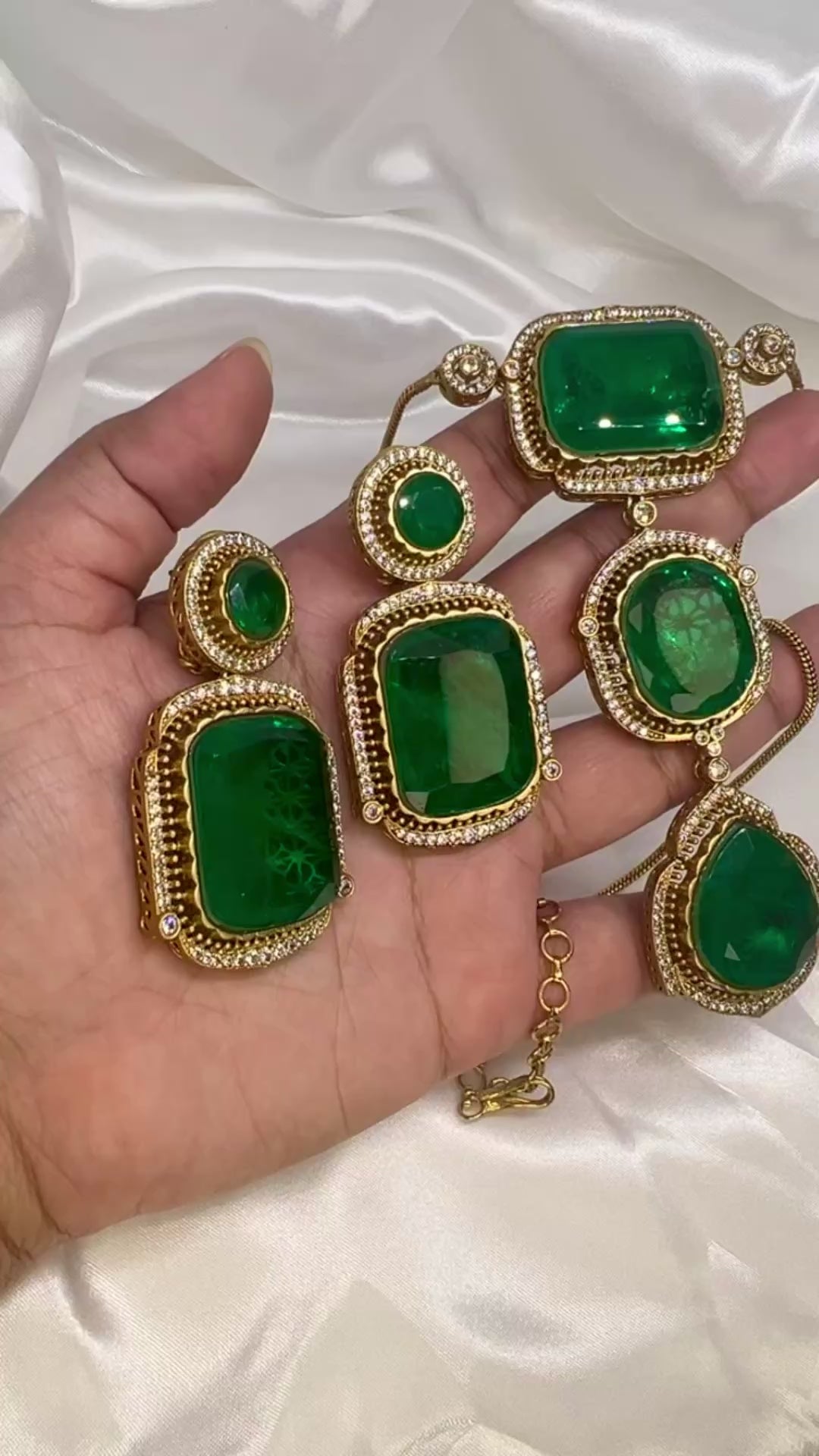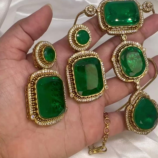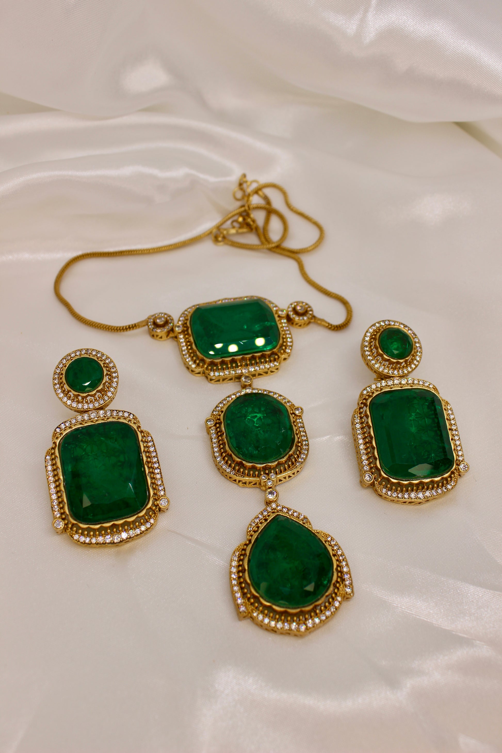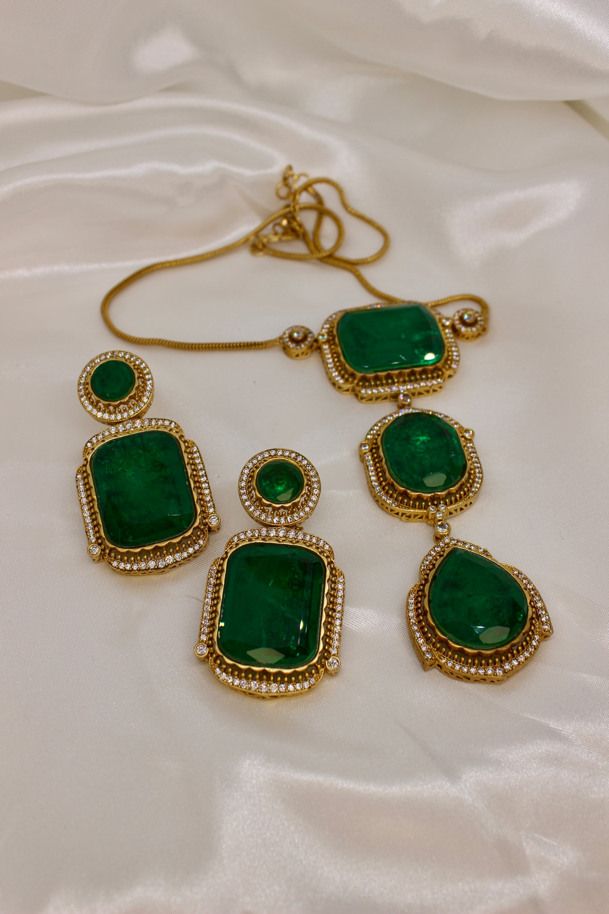The Raveena Necklace Set is a bold statement in emerald doublet stones framed by antique gold and accented with delicate diamonds. Both versatile and striking, the set can be worn as a complete look or styled with the necklace or earrings on their own. Designed to pair seamlessly with traditional attire or contemporary fashion, this piece commands attention wherever it goes.